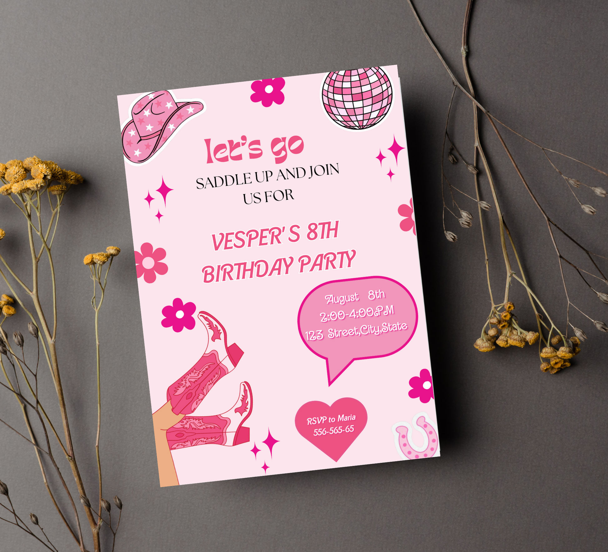 Saddle up for a stylish celebration with this Barbie Cowgirl Cowboy Birthday Party Invitation! Featuring pink western details, cowgirl hats, boots, stars, and Barbie-inspired glam, this editable Canva template is perfect for rodeo birthdays and wild west party themes. Customize instantly, download, and print or share digitally for the cutest cowgirl-cowboy birthday roundup!