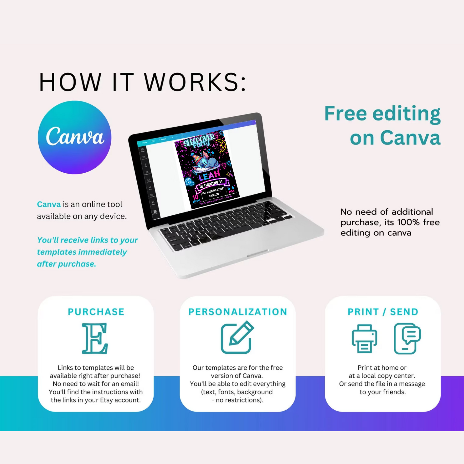 Once payment is confirmed, you will get an email sent to your registered Etsy account, containing the link for you to access your editable design. Make sure the e-mail address registered in your Etsy account is current.