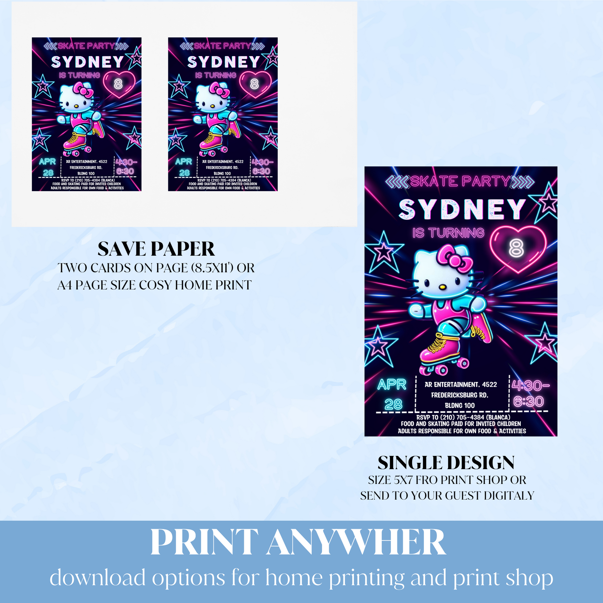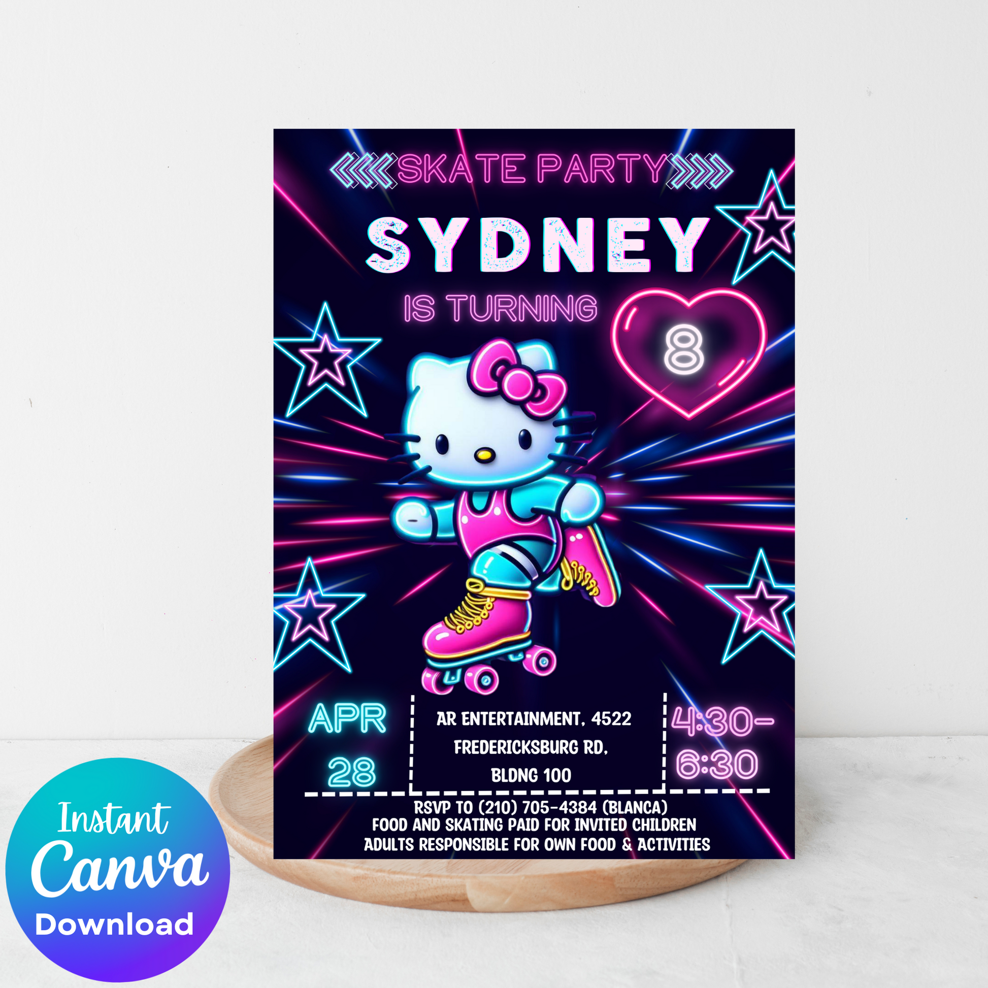 Hello Kitty Neon Roller Skating Birthday Invitation | Fun & Customizable Glow Party Invite